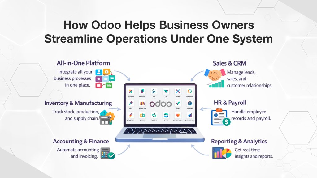 In short, Odoo helps business owners manage business in one system using Odoo, creating a seamless operational environment that drives efficiency and growth.